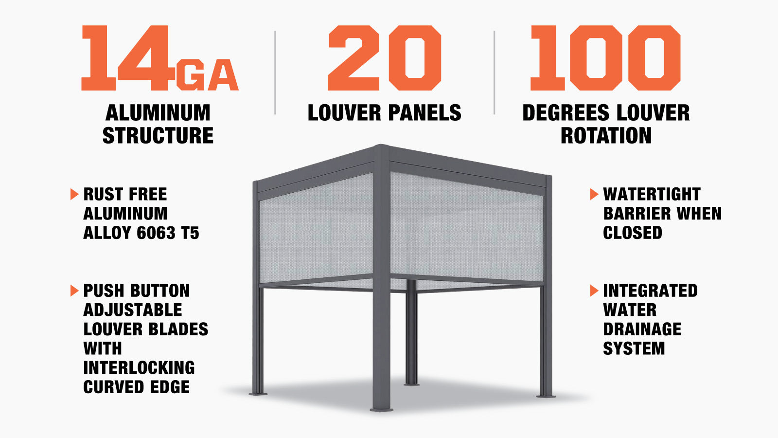TMG LIVING Pergola de toit à persiennes motorisées en aluminium 10 pi x 10 pi avec écrans latéraux, TMG-LPG11