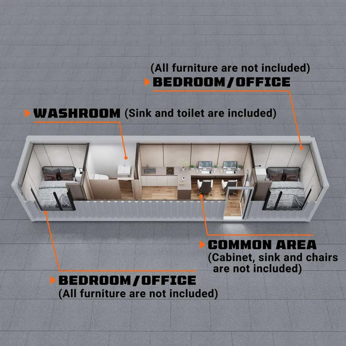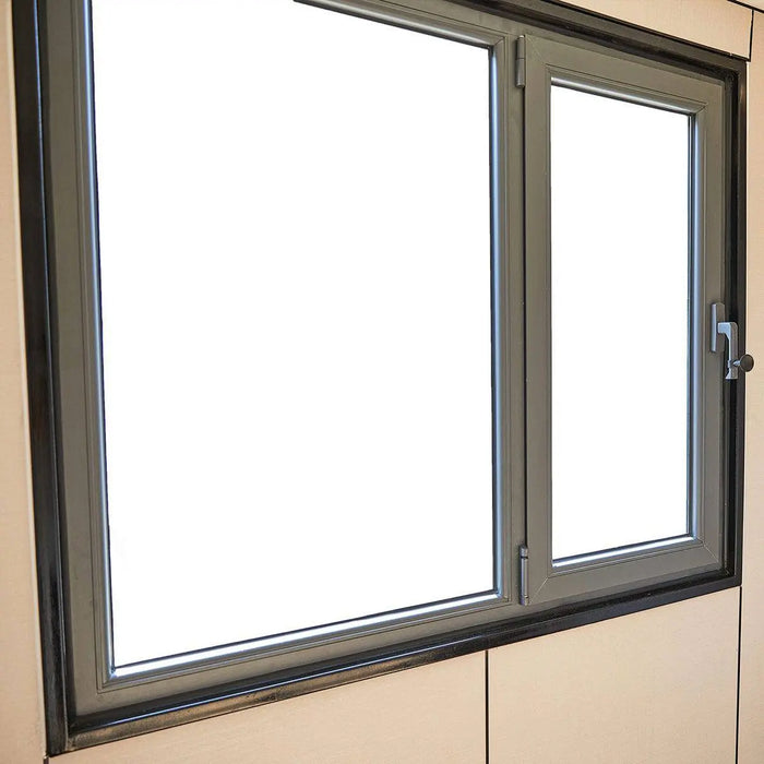 The 40’ heavy-duty galvanized steel frame is durable and strong, ensuring a safe and secure workspace. Inside, you'll find a thoughtfully designed layout that includes environmentally friendly wood grain wallboard, PVC flooring, and robust doors with aluminum frames and triple-layer glazed tempered glass windows. The horizontal pivoting windows allow for ventilation even on rainy days, and its high-density foam insulation guarantees optimal temperature control, making it suitable for any location and climate.