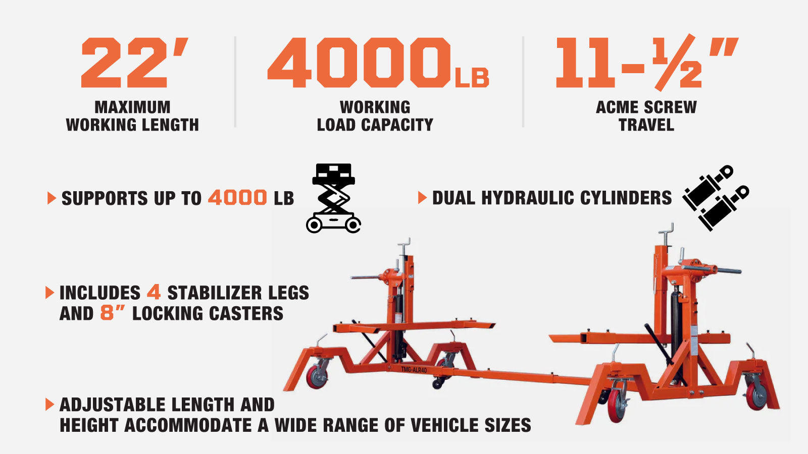 4000 LB Car Automotive Rotisserie, Dual Hydraulic Cylinders, 8" Locking Casters, 22’ Working Length, TMG-ALR40
