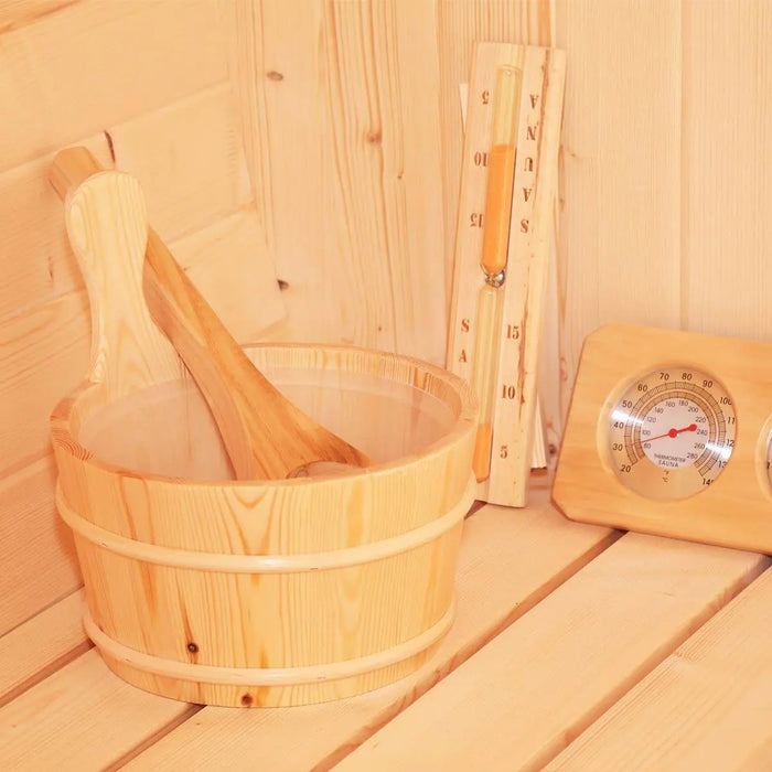 • Water bucket, sauna stove, sand timer and other accessories included for an all around spa experience at home without the need for fees or travel