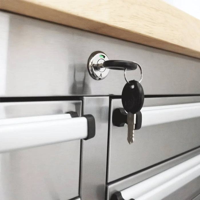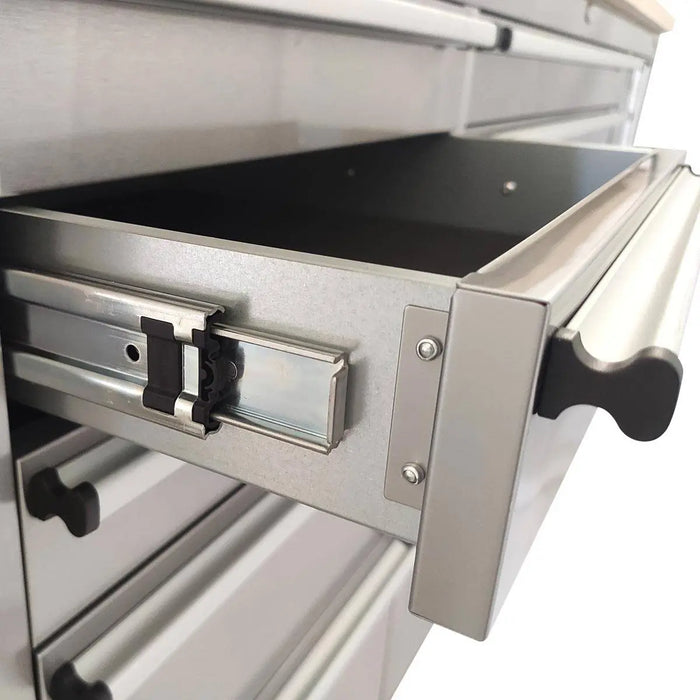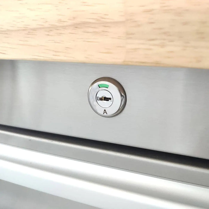 TMG Industrial 96" Établi roulant en acier inoxydable, dessus de table en bois d'hévéa, 24 tiroirs verrouillables, roues verrouillables, TMG-WB9624S