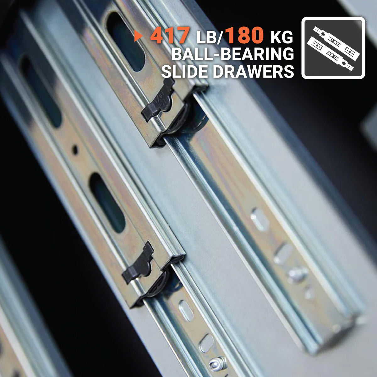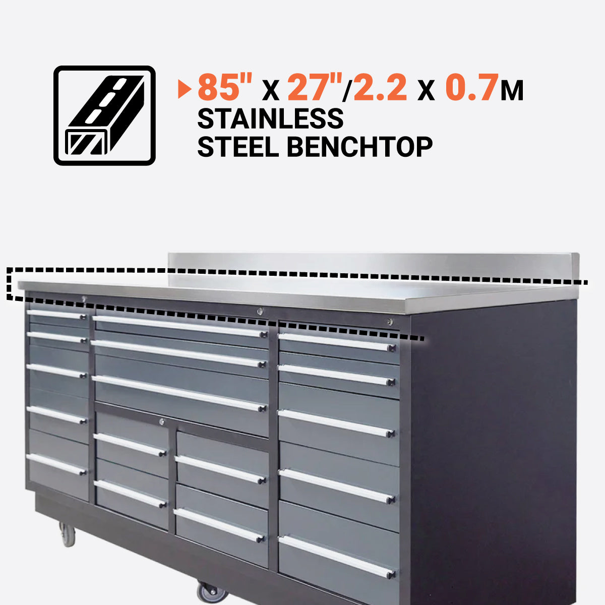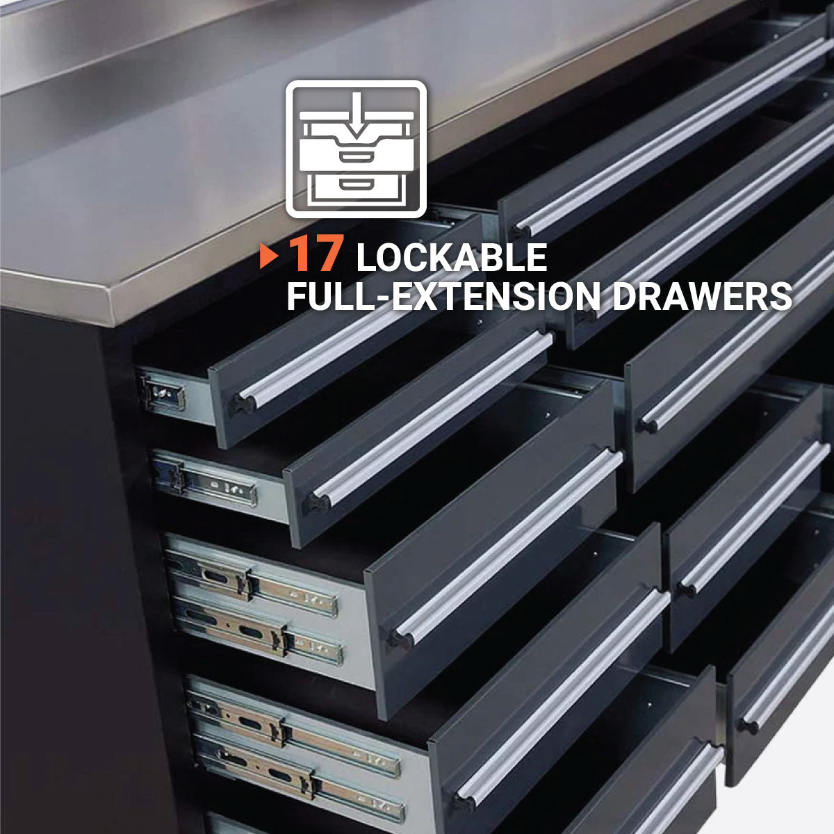 Pro Series 7-Ft 17-Drawer Workbench with Stainless Steel Top, Ball Bearing Double Slides & Casters TMG-WB717