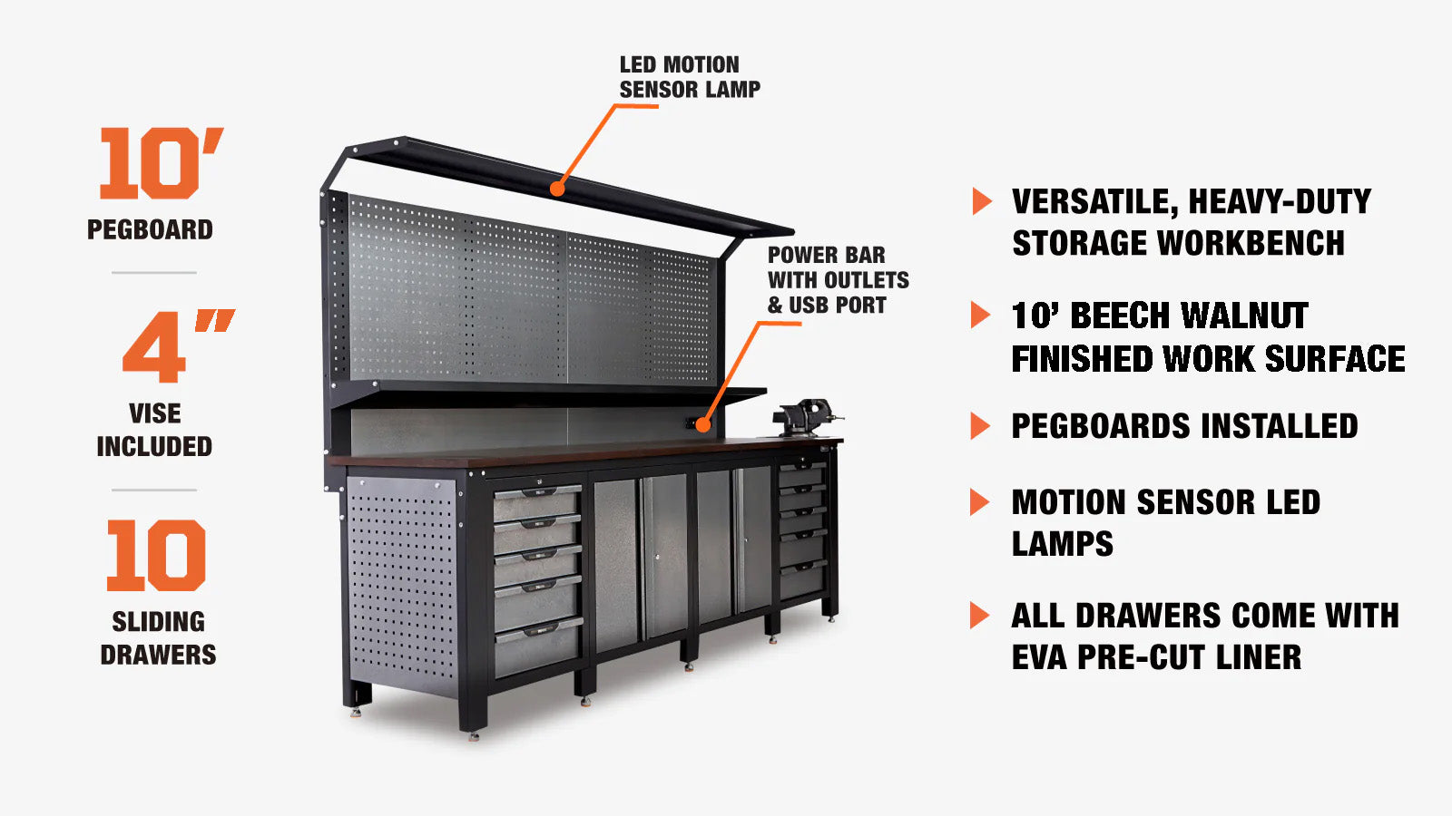 📞 1-877-761-2819Call Us TMG 10' Commercial-Grade Workbench w/Pegboard, Solid Wood Top, Bench Vice Skip to content