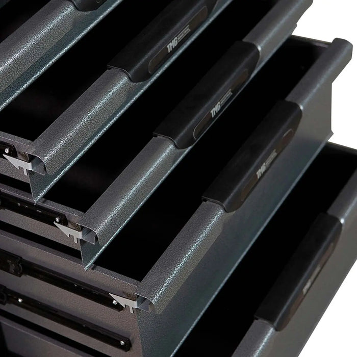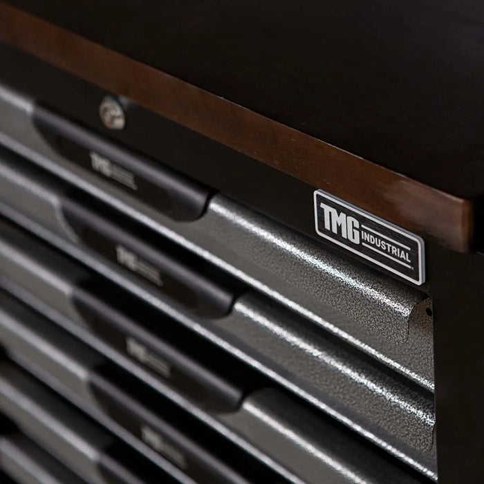 The TMG-WBM12 Extreme-Duty Steel Garage Tool Chest is a versatile, commercial strength tool storage and work surface solution for your home garage, repair shop, automotive business or any other industrial setting. Six cabinets and 12 lockable sliding drawers of varying sizes provide maximum storage possibilities, and a beech wood finished work surface for long term smooth workflow that is resistant to scratches, impact and wear.