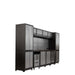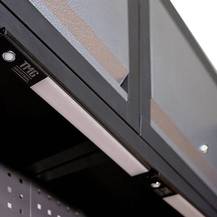 Adjustable shelving is installed inside each cabinet for optimized storage and utility, and four overhead compartments have also been engineered into the design with lift assisted upswinging doors. Integrated power bars with USB ports makes for efficient tool battery or phone charging, and also included are magnetic LED motion sensor lamps for precise work table accuracy.