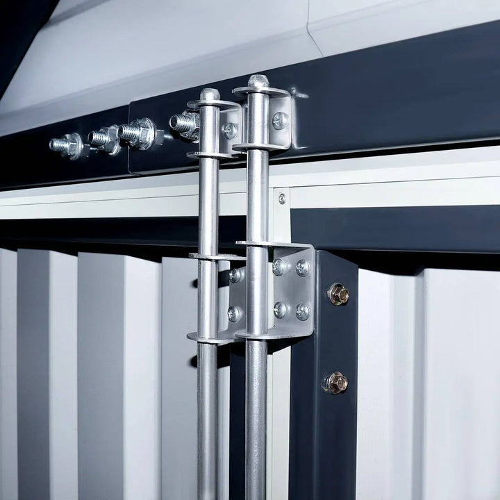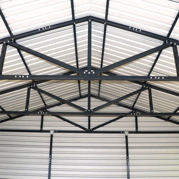 The sloped gable roof helps shed snow and rain, while the slip-fit base frame with sleeve anchor bolts allows for quick installation on wood or concrete foundations. The open-span design inside provides maximum interior space and flexible storage options.