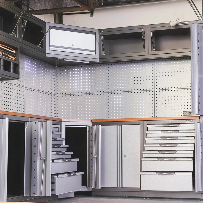 Extreme-Duty Steel Garage Corner (11’ + 8.5’) Tool Chest w/Pegboard, Power Outlets, USB Port, Magnetic Motion LED Lamps, TMG-WBM15
