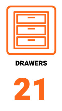• 21 drawers, seven shelving cabinets and six overhead compartments total (see drawing for dimension details)